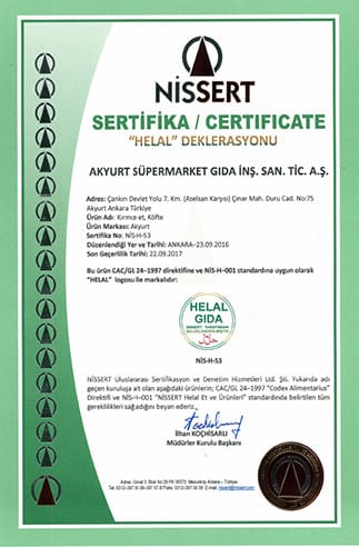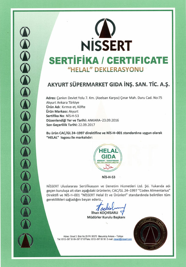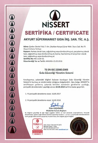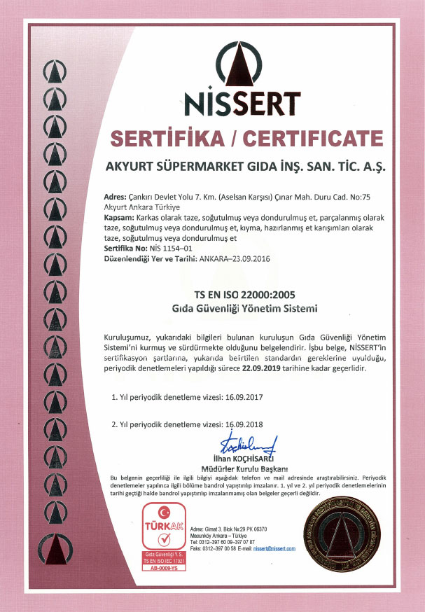 Et entegre tesisimiz Gıda, Tarım ve Hayvancılık Bakanlığı onayı ile veteriner hekim gözetiminde sıhhi şartlara uygun ve alanında uzman kişilerle tüm kalite standartlarına uygun olarak hizmet vermektedir. Akyurt Et İşleme Tesisinin dünya standartlarında kontrolleri düzenli olarak yapılmaktadır.